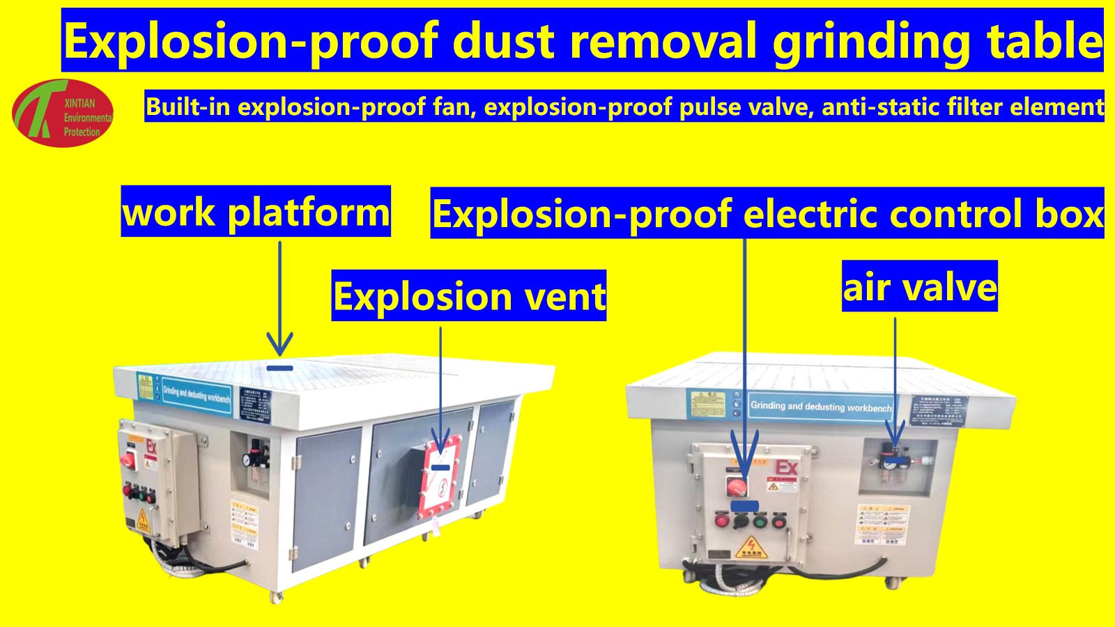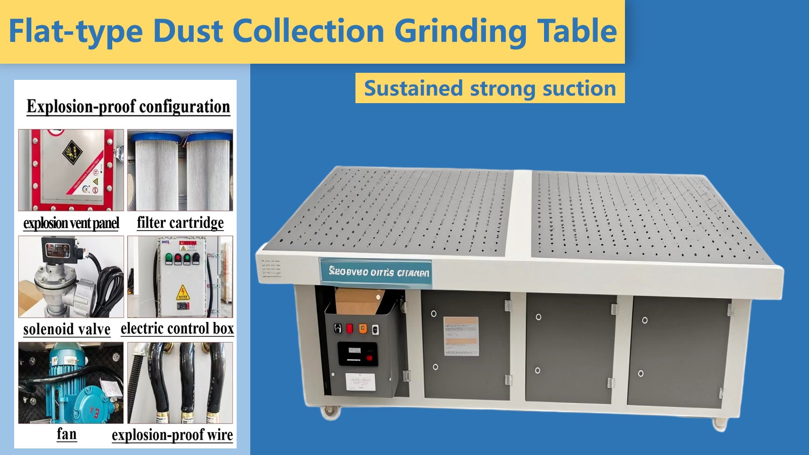 Kompaktiška konstrukcija: Plokščias dulkes sugeriantis šlifavimo stalas užima nedidelį plotą ir tinka įvairioms darbo vietoms, ypač dirbtuvėms ar studijoms su ribota erdve.